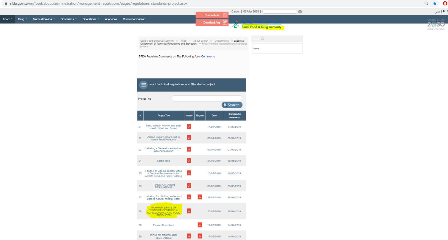 Este documento está disponible sólamente en árabe, aunque la información realmente importante (las tablas de LMR) están en inglés. Asimismo existe un documento creado por el gobierno indio que traduce casi íntegramente al inglés el documento original. Digo casi íntegramente porque por ejemplo no traduce las tres últimas tablas ( LMR de dátiles, LMR de comida para bebés (babyfood) y materias activas prohibidas en babyfood). Si necesitáis una traducción entera no dudéis en pedirla a través de limitemaximoresiduos@gmail.com