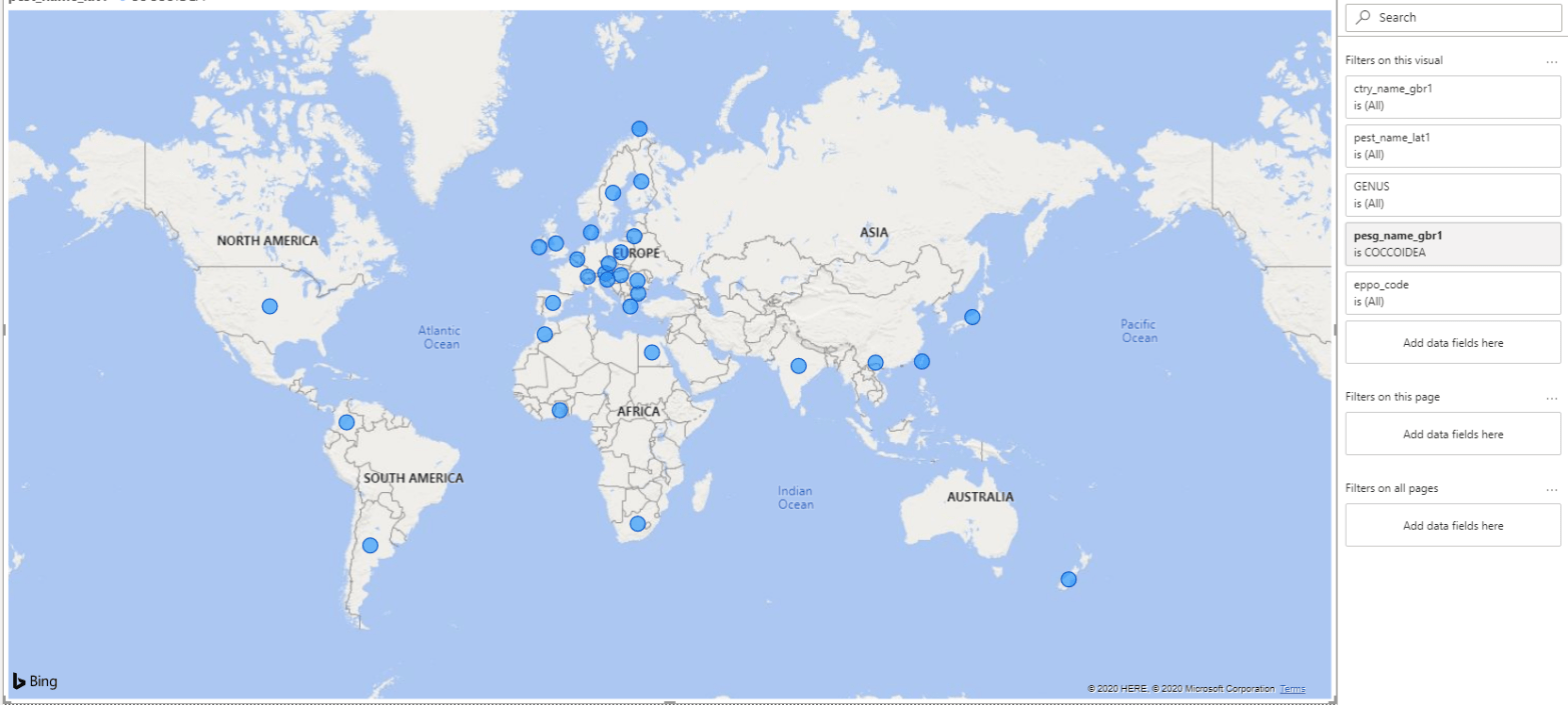 De esta forma al introducir bien el nombre científico de la plaga, bien el género, bien la familia o bien el código EPPO, aparecen señalados en un mapamundi los países que disponen de una solución registrada para esa plaga en concreto.