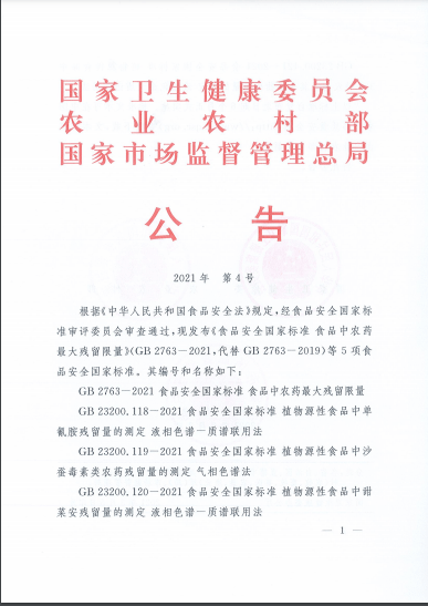 Actualmente el documento GB 2763-2019 regula los límites máximos de resíduo (LMR) para la exportación de alimentos a China. Sin embargo, tal documento pronto quedará obsoleto ya que el ministerio de agricultura y asuntos rurales chino ha anunciado el pasado 3 de marzo a través de un comunicado la entrada en vigor del nuevo documento GB 2763-2021 el 3 de septiembre de 2021.