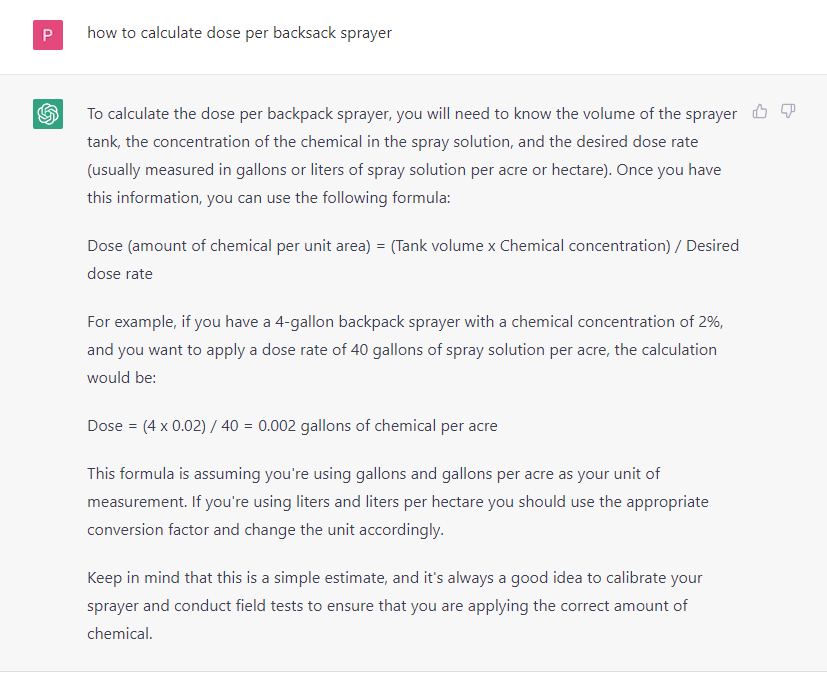 Por último, comentar que le he preguntado a ChatGPT ¿cómo calcular la dosis por mochila? y los resultados han sido muy buenos en inglés (ver imagen abajo 3.2) pero no tan buenos en español (ver imagen abajo 3.1). Por eso creo que esta entrada de blog puede resultar de utilidad para los hispanohablantes.
