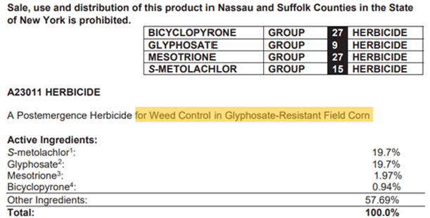 Antiguamente, para controlar las malas hierbas en una finca donde se cultivaba máiz transgénico resistente al glifosato, bastaba con pulverizar glifosato. Las malas hierbas perecían y el maíz prosperaba. Como se ve en la imagen superior, hoy se necesitan hasta cuatro materias activas (biciclopirone, glifosato, mesotrione y se-metolaclor) para conseguir el mismo efecto.