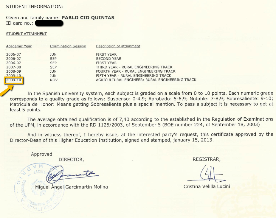 Certificado de notas expedido en la Escuela y que utilicé para solicitar las becas La Caixa y Barrié de la Maza a las que llegué a la fase final de entrevista personal pero que no pude conseguir.